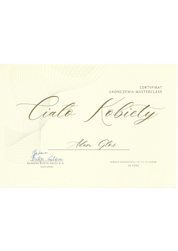 Adam Głos to doświadczony technik masażysta z ponad 15-letnim stażem. Jego misją jest pomaganie innym w dążeniu do polepszenia zdrowia i samopoczucia poprzez terapie czaszkowo – krzyżową. Dzięki zaangażowaniu i umiejętnościom, Adam zyskał grono zadowolonych klientów, a jego celem jest dotarcie do jak największej liczby osób, by wspierać ich w trudnych momentach. Wierzy, że każdy zasługuje na pomoc i wsparcie w dążeniu do osobistego rozwoju i harmonii.